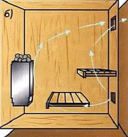 Важно: Главная и единственная функция вентиляции — создание и регулирование постоянных потоков горячего и холодного воздуха, направление каждого из них в нужное «русло» и поддержка в парилке необходимого микроклимата. Распространенные схемы вентиляции предоставлены на рисунке ниже.