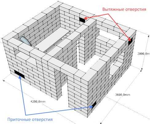 - В стенке за печью на высоте 20 см от поверхности пола сделать отдушину, поперечные размеры которой должны иметь 10-20 см. Второе отверстие формируют на противоположной стене, располагая его по диагонали к первой отдушине за печью на 20 см ниже уровня потолка.
