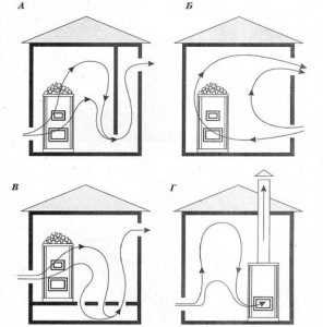 Лучшие результаты дает вентиляция бани – схема которой соответствует одному из пяти основных вариантов.