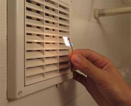 При нормальном потоке воздуха бумага прилипнет к вытяжному отверстию. В противном случае можно констатировать факт отсутствия нормального воздухообмена в квартире.