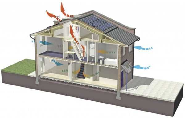 В жилом помещении происходит разрежение воздуха, оно затягивает свежий поток воздуха с улицы через специальные отверстия в конструкции дома. Поступившие воздушные массы имеют более тяжелую структуру, поэтому располагаются внизу помещений. Они воздействуют на легкий теплый воздух, и он (легкий теплый воздух) вытесняется из комнат наружу.
