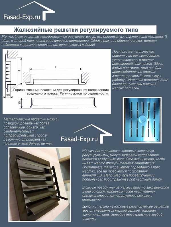 Регулируемые | Такие вентиляционные решетки снабжены подвижными жалюзи, регулируя которые, владелец дома сможет контролировать движение воздуха. Достигается это за счет уменьшения пространства между планками жалюзи. Основной плюс – возможность индивидуально подстроить наиболее комфортный для вас поток воздуха. |