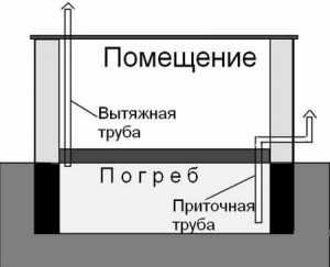 Приточный воздухопровод обеспечивает приток свежего воздуха в помещение для хранения продуктов. Устанавливается он в углу таким образом, чтобы его открытый конец был на высоте 20-50 см. от пола. Воздуховод должен находиться в строго вертикальном положении, проходить по углу помещения и выходить на улицу, возвышаясь над постройкой не менее чем на 0,5 м.- Вытяжной воздухопровод обеспечивает вытяжку воздуха с большим содержанием углекислого газа за пределы хранилища. Он монтируется вдоль угла помещения строго с противоположной стороны от приточного воздуховода так, чтобы открытый конец трубы находился от потолка, на расстоянии 20 см.