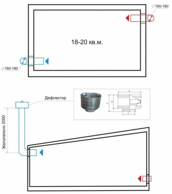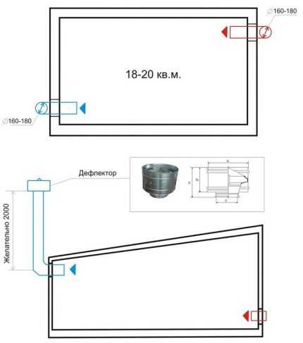 Схема комбинированной вентиляции схожа полностью с устройством системы естественного воздухообмена. Применяется то же расположение приточного и вытяжного воздуховодов, то же сечение воздушных труб и дефлектор на верхнем конце вытяжного канала.