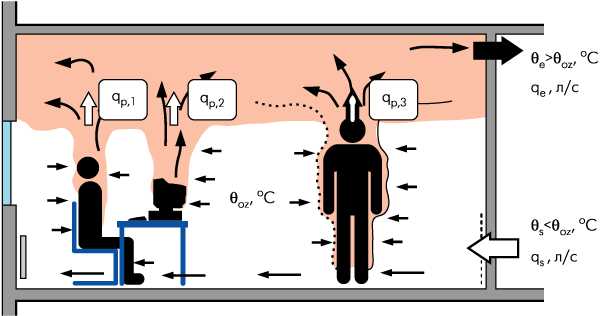 Для обеспечения устойчивой вытесняющей вентиляции объемы подаваемого воздуха (qs) должны равняться сумме объемов воздуха в конвективных потоках над тепловыми источниками на уровне границы раздела, уровня стратификации, нижней зоны помещения, заполненной свежим и чистым воздухом, и верхней зоны, заполненной загрязненным воздухом (рис. 1):