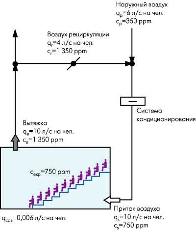 Зачастую оказывается, что объемы воздуха, необходимые для обеспечения теплового комфорта, значительно больше, чем требуется для получения максимальных преимуществ по качеству воздуха в системах вытесняющей вентиляции (от 10 до 20 л/с на человека). В этом случае экономически целесообразным решением, по сравнению с прямоточными системами, может стать рециркуляция. Предположим, что объем вентиляционного воздуха составляет 10 л/с на человека, при этом 40 % этого воздуха идет по рециркуляции. В этом случае концентрация СО2 в зоне дыхания составит примерно 900 ppm, тогда как в помещении с перемешивающей системой вентиляции она поднимется до 1 350 ppm. Таким образом, система вытесняющей вентиляции дает ощутимые преимущества и в плане качества воздуха, и в плане экономии энергоресурсов по кондиционированию помещений.