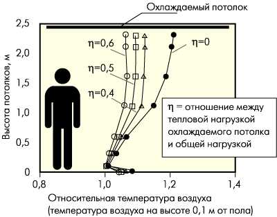 Вертикальный градиент температуры воздуха в помещении не должен превышать 1,5–2 °C, что фактически ограничивает разность температур между зоной обслуживания, нижней зоной и верхней зоной вытяжки. При определенной температуре воздуха в обслуживаемой зоне температура приточного воздуха (при вытесняющей вентиляции) не может быть низкой, как это происходит в системах перемешивающей вентиляции. В помещениях с потолками высотой около 2,4 м разность температур составляет примерно 2 °C. В помещениях с более высокими потолками это значение может повышаться.