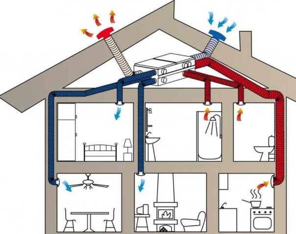 Есть и другой вариант — монтируется система воздуховодов. В помещение заходит 1 труба с 1 вентилятором, и разветвляется: в каждое помещение заводится участок, через который будет поступать воздух.