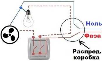 Если проводка уже разведена, и лишний раз долбить стены не хочется, то фазу для вентилятора можно взять с выключателя освещения, разделив ее посредством двойного выключателя, а ноль – в ближайшей распределительной коробке.