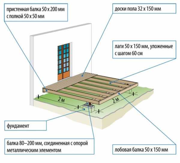 - У вас может возникнуть вопрос: «Куда будет опираться край настила, раз между домом и каркасом под настил есть полуметровый разрыв?». Тут нужно ориентироваться по обстоятельствам. Если у дома есть выступающий цоколь, он тоже может послужить опорой. Но чаще всего вдоль стены монтируется толстый брус, с помощью которого и осуществляется примыкание террасы.