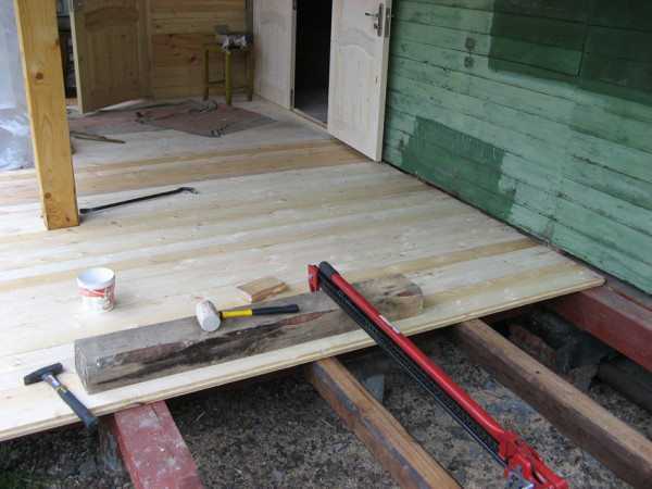 - Сверху набиваем обработанные доски толщиной не менее тридцати сантиметров. Из неё же формируем и ступени крыльца.