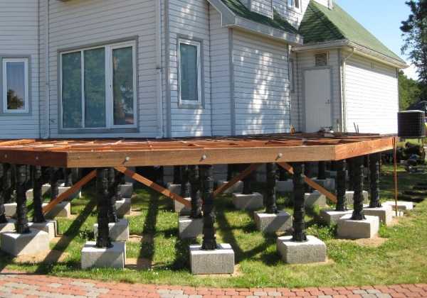 Терраса возле дома может быть и такой- Допустим, размер вашей террасы будет 5*3м. Как рассчитать под неё количество опор, если фундамент будет точечным?. Начертите себе план фундамента, равномерно распределив по нему точки опор. Если это будут винтовые или монолитные сваи, схема поля будет примерно такой. В непосредственной близости от существующего фундамента, земляные работы не производят.