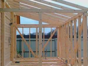 На следующем этапе начинают формировать основной каркас веранды. Берут балки 50х100 мм и крепят их по углам конструкции на металлические скобы, выравнивая по вертикали. Причем две балки, которые будут находиться от стены дома, берутся выше из расчёта угла наклона будущей крыши не менее 150. На время, пока не построена верхняя обвязка, столбы крепятся диагональными брусьями к нижней обвязке. Вблизи стен дома балки также устанавливаются в вертикальном положении независимо от ровности стен и на болты или скобы прочно их закрепляют. Образуемые щели ликвидируют в процессе обшивки стен.