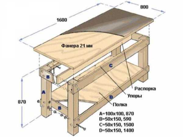 Длина столешницы должна быть такой, чтобы на ней с легкостью размещались инструменты и крупные детали, которые требуются для работы. Ширина ее не должна быть больше 50 – 60 см. Это позволяет дотягиваться без труда до противоположного края. Одна сторона может быть оборудована для работы с электрическим режущим инструментом: циркулярной пилой, лобзиком и т. п. С этой целью закрепляют дощечку таким образом, чтобы она выступала за край верстака на 200 – 300 мм.