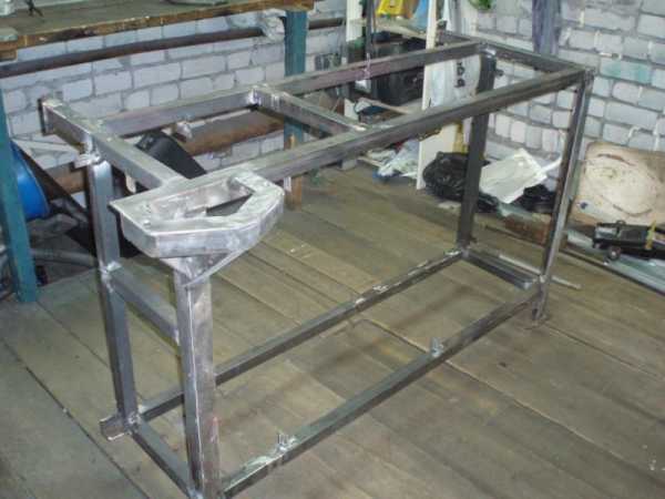 Вторая стадия – сварка каркаса. Его создают из профиля. Начинают с элементов столешницы, приваривая первыми две трубы по 2,2 м и две по 0,75 м. При этом нужно учитывать, что сверху основного предстоит приварить для столешницы дополнительный каркас из уголков. Последнюю армируют, наваривая с интервалом в 40 см ребра жесткости, также представленные стальными трубами. Далее по краям приваривают 4 ножки длиной 0,9 м.