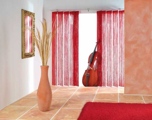 Вертикальные веревочные жалюзи изготавливают из таких же материалов, что и нитяные занавески. Они также могут быть выполнены из разных по цвету и фактуре нитей и украшены бусами, стразами или стеклярусом.