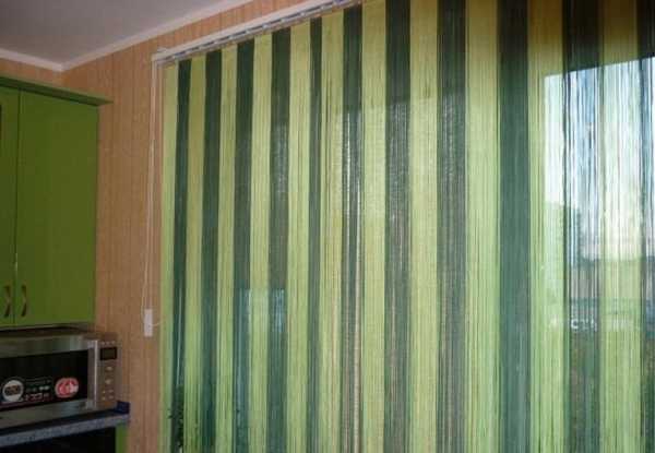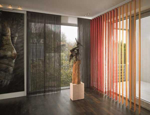 - Верёвочные. Такие жалюзи очень схожи на шторы из кисеи. Материал здесь – это многочисленные тонкие ленточки или нити. Они могут быть разноцветными однотонными и разнофактурными. Часто такую модель используют для оформления дверных проемов.