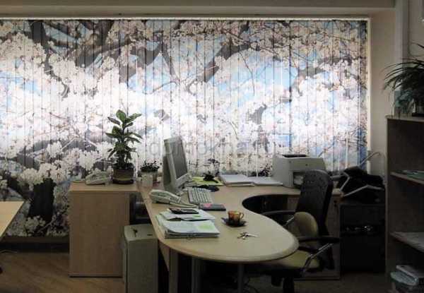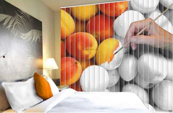 - С фотопечатью. Очень популярны и практичны такие занавесы. На полотнах изображается какой-то определённый рисунок или орнамент и при повороте их в одну сторону он как пазл складывается. Особенной популярностью занавесы с фотопечатью пользуются для детских комнат и для офисов (ведь на них часто изображают рекламу или логотип фирмы).