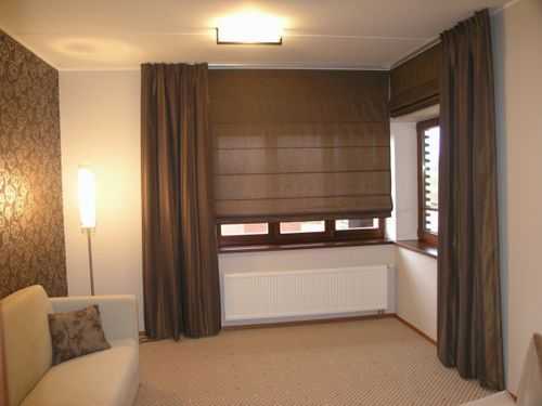 Когда подбирается оконное оформление, то желательно, чтобы его цвет был похож по цвету на мебельную обивку или текстиль в виде чехлов, покрывал. Так они будут перекликаться, создавая единое пространство.