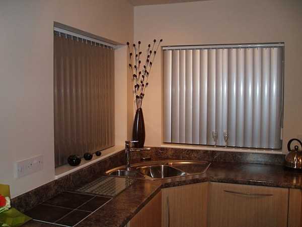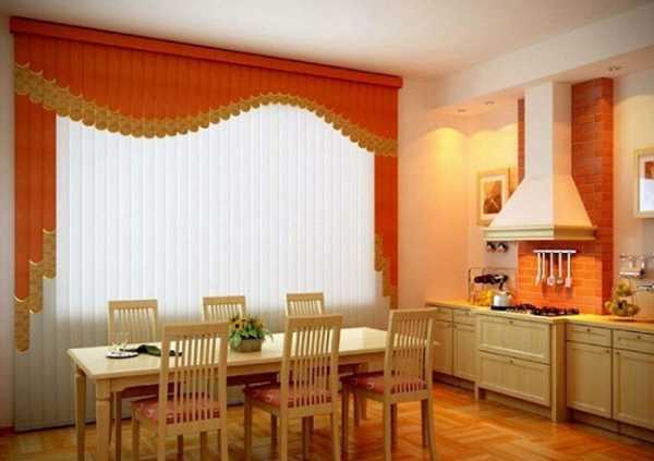 Пластиковые вертикальные жалюзи на кухне, выполненной в классическом современном стилеДеревянные