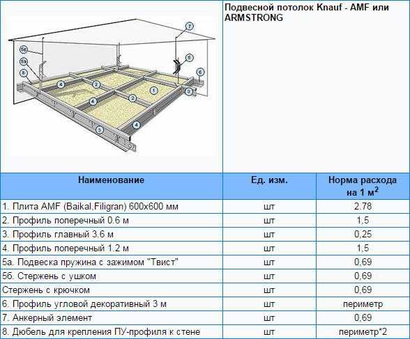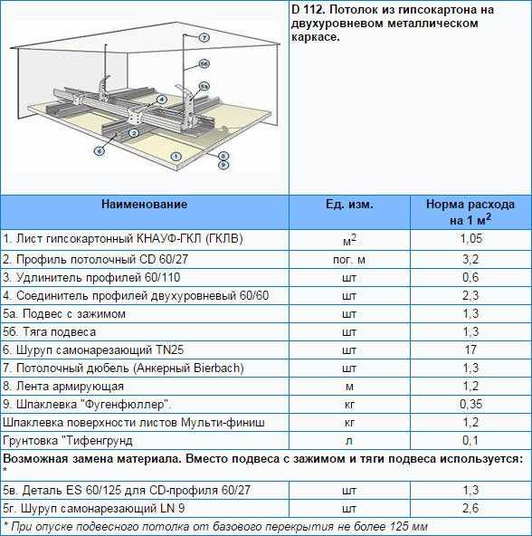 Расход материалов на 1м2 при устройстве различных подсистем из гипсокартонных листов