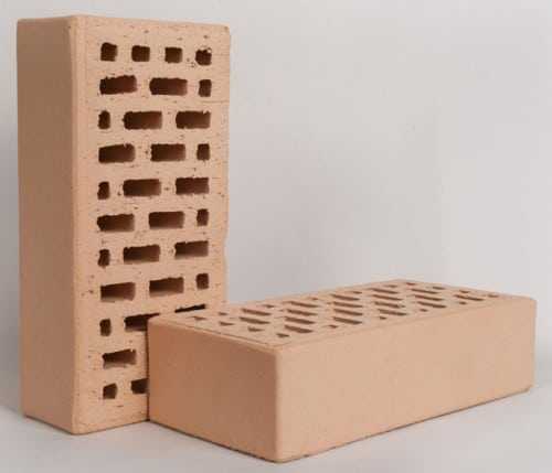 - Пустотелые (теплые). Благодаря пустотам (их часть составляет от 20 до 45% от объема изделия) они создают прослойку воздуха, которая позволяет удерживать накопившееся в здании тепло. Пустотелый кирпич весит около 2,5 кг.