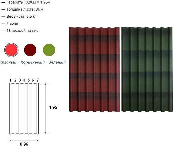 Ондулин выпускается стандартных размеров: длина листа — 2000 мм, ширина — 950 мм. Высота волны — 36 мм. Вес листа составляет 6,4 кг, его толщина — 3 мм.