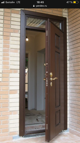 Причём эта входная дверь с окном сверху имеет и кованою решётку на нём. По стилистики кованый решётки одинаковые. Но, по-моему, вышло неплохо. Стеклопакеты имеют зеркальную отражающую поверхность, что позволяет ими пользоваться как обычным зеркалом.