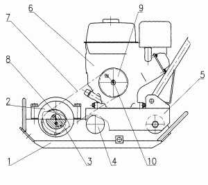 Чтобы понять, как работает виброплита, сначала потребуется рассмотреть ее схему и устройство. Конструкция агрегата с вибровалом состоит из следующих узлов: