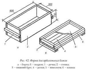 Формы можно смастерить самостоятельно, используя деревянные ящики со съемным дном. Чтобы впоследствии блок легко можно было вынуть из формы, изнутри ее рекомендуется оббить линолеумом. Оптимальные размеры 25х25х50 см.