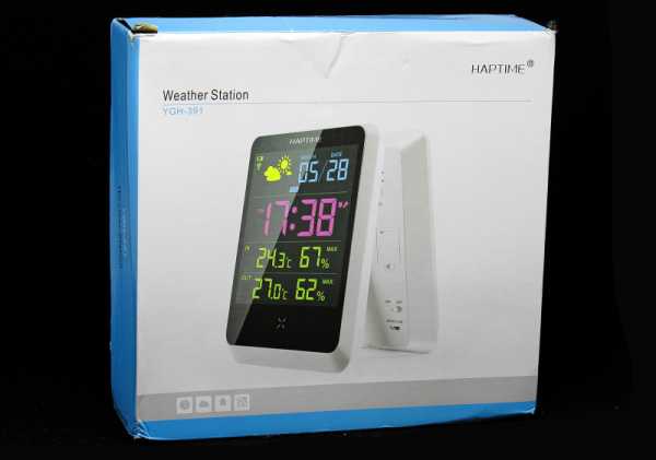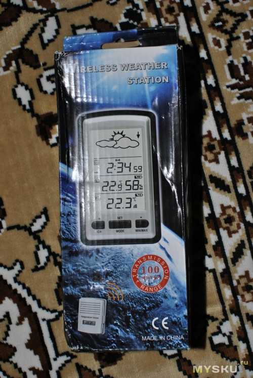Метеостанция упакована в обычную картонную коробку с цветной полиграфией.