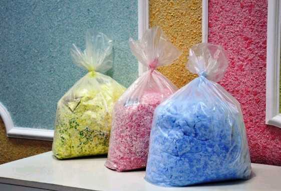 Неподдельный интерес эти обои вызывают сразу же, как только их видишь. Это не привычные рулоны, а какой-то порошок в полиэтиленовых пакетах. Увидев этот разноцветный порошок, да еще и с опилками, сразу задаешься вопросом, как же их клеить и вообще, что здесь жидкого?