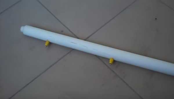 Конструкция этой поильной системы незначительно отличается от предыдущей: бак расположен не по центру, а с одного из торцов трубы. Его роль также может выполнять отрезок такой же трубы или пластиковая бутылка. Рассмотрим второй вариант.