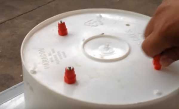 В крышке сосуда делаются дыры. В них вставляются ниппели, после чего ведро заполняется водой. Можете считать, что поилка для кур своими руками сделана.