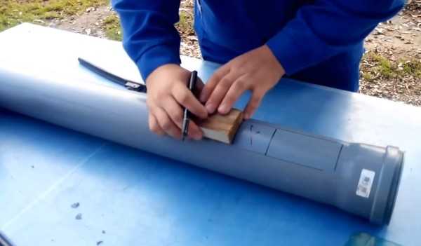 1. Берем трубу диаметром 150 мм, длиной 1,5 метра. Один край закрываем заглушкой, на противоположном – изгибание. Уровнем отчерчиваем линии (по двум сторонам) вдоль всей трубки.