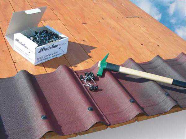 - Уложите листы Ондувиллы поверх основания и закрепите вентиляционную трубу при помощи фирменных гвоздей.