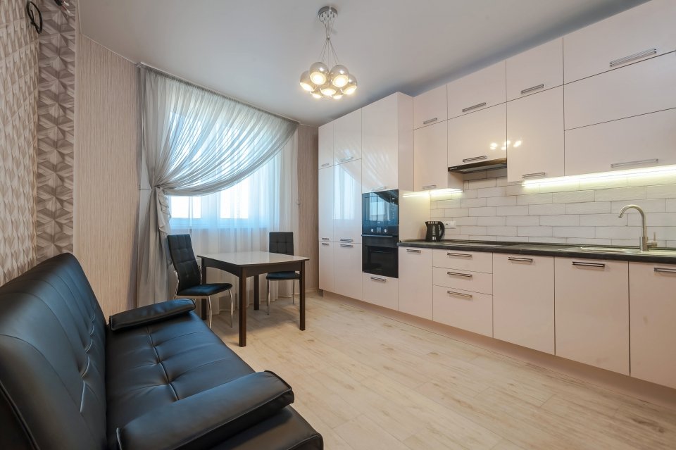 В новостройке произвели ремонт квартиры. Совместили ванную комнату и туалет, с последующим комплексом ремонтно-отделочных работ. Подготовили поверхности стен и пола. Наклеили обои, сделали монтаж натяжного потолка и уложили кварцвиниловую плитку. Установили межкомнатные двери.