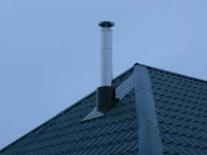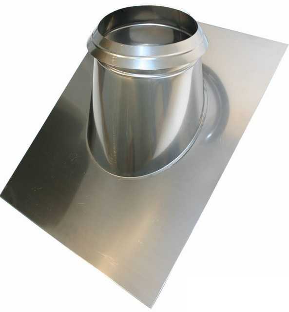 Продолжают сборку сэндвич-дымохода прокладкой его сквозь кровлю. В этом случае используется специальная конструкция – крышная разделка. Приобрести ее можно в магазине стройматериалов. При выборе следует учитывать угол наклона стропил. В кровле делают отверстие (с предварительной разметкой) такого диаметра, чтобы труба проходила в нее свободно.