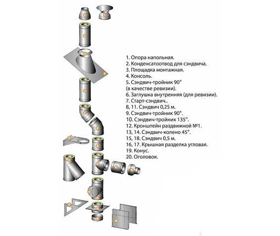 Сэндвич-трубы имеют не только прямую форму. Поскольку дымоход должен проходить через перекрытия и кровлю, а на его пути могут встречаться различные элементы здания, конструкция содержит в себе секционные фрагменты и дополнительные элементы для их соединения.