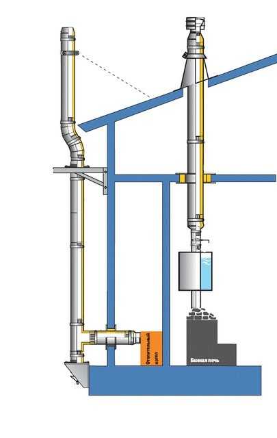 - Подобная схема дымохода вполне может размещаться снаружи здания – это облегчает и ускоряет монтаж, экономит пространство внутри жилых или технических помещений.