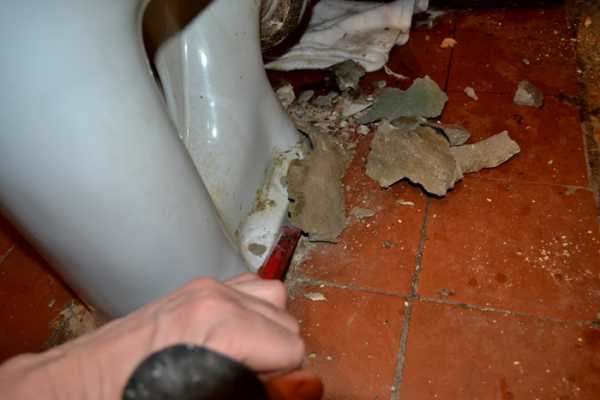 Под демонтируемым прибором в старых домах часто можно обнаружить прогнившие опоры. Их необходимо удалить при помощи зубила либо перфоратора.Легче всего даётся демонтаж чаши, прикреплённой к основанию клеевой мастикой – достаточно ударить по основанию подошвы чаши по направлению от себя. Такой способ крепления считается некачественным и говорит о непрофессиональной установке старого сантехнического прибора.