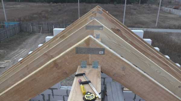 Обратите внимание! При этом рекомендуется подпирать стык двух элементов стойкой-опорой для повышенной надежности. Опору желательно располагать на расстоянии в одну четвертую длины диагонального стропила от конькового элемента.