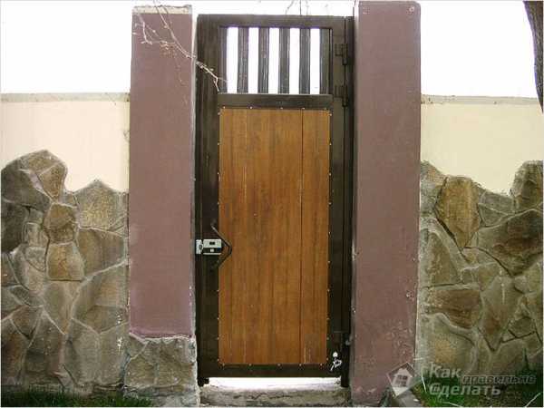- Комбинированные калитки. Соединяют ажурную и глухую конструкции. Самое распространенное сочетание: глухой низ и ажурный верх, благодаря этому калитка не кажется такой громоздкой и тяжелой.