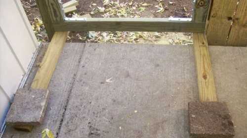 - Выставить ограду в проем, подложив под полотно деревянный брус толщиной 10 см.