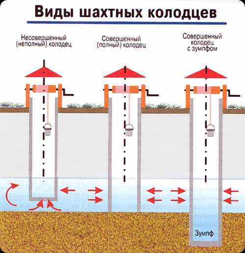 Они отличаются тем, что в первом случае вода в сруб поступает через дно или боковые стенки, во втором – проходит сквозь водоупорный пласт. В засушливых районах дополнительно сооружают зумпф – подземный резервуар для воды.