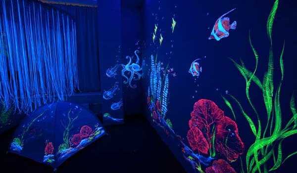 Отдельного внимания заслуживает флуоресцентная краска для стен. Она представляет собой смесь прозрачного закрепителя и специального пигмента флуоресцентного. Этот пигмент обеспечивает свечение поверхности при появлении ультрафиолетового света.