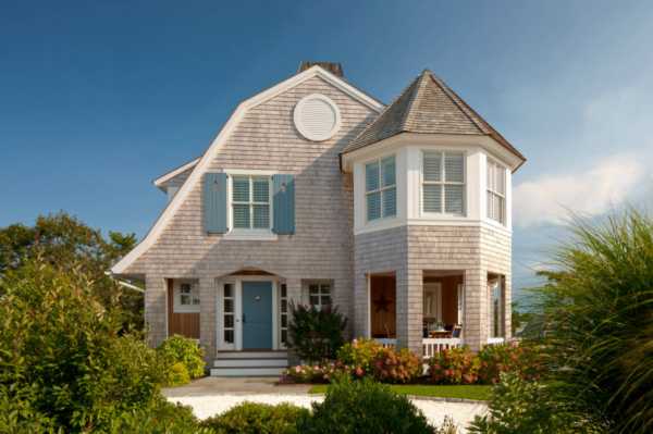 Отличительная особенность английских домов с мансардой — большой уклон скатов кровли и несколько асимметрично расположенных фронтонов. Необычность такой архитектуры усиливается за счет синего цвета фасадной отделки в сочетании с серым кровельным покрытием.
