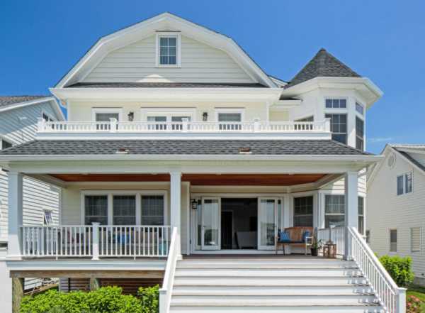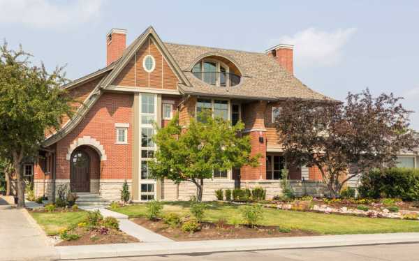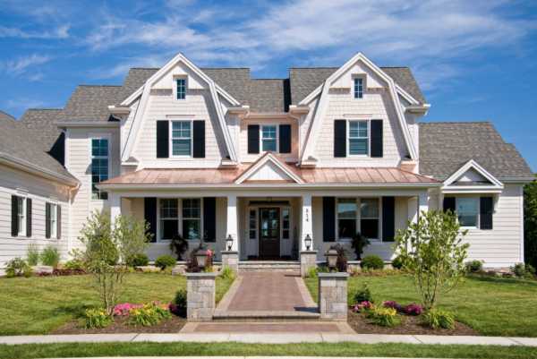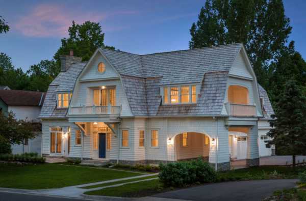 Современная интерпретация викторианской архитектуры — дом с вальмовой крышей и мансардой с небольшими балконами.