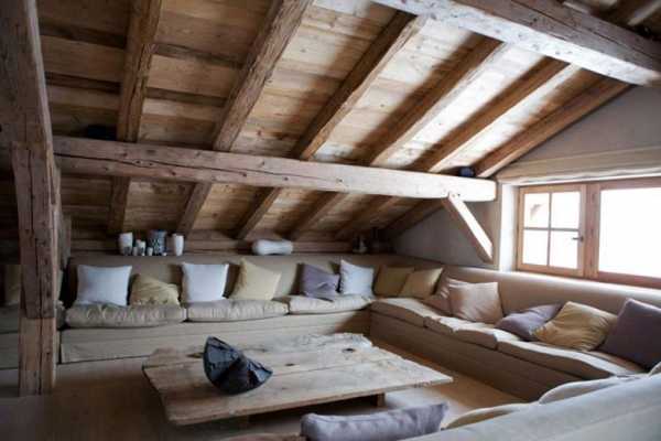 Внутреннее пространство мансарды под крышей шале очень колоритно смотрится за счет видимых стропил и дощатой обшивки.