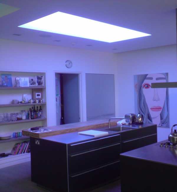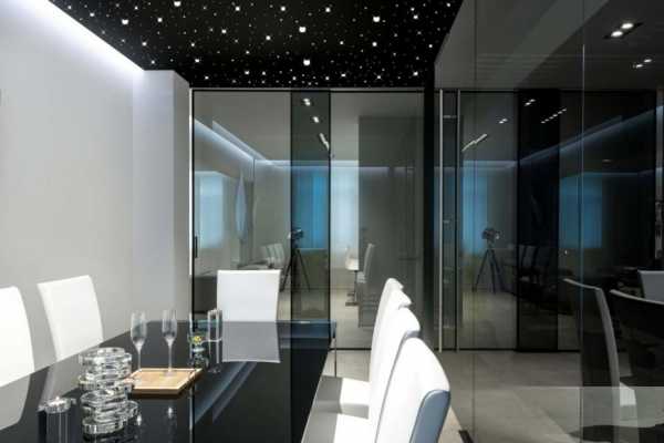 Популярный у творческих людей дизайн в стиле хай-тек лучше всего дополнить полупрозрачным потолком и установить современную точечную подсветку.